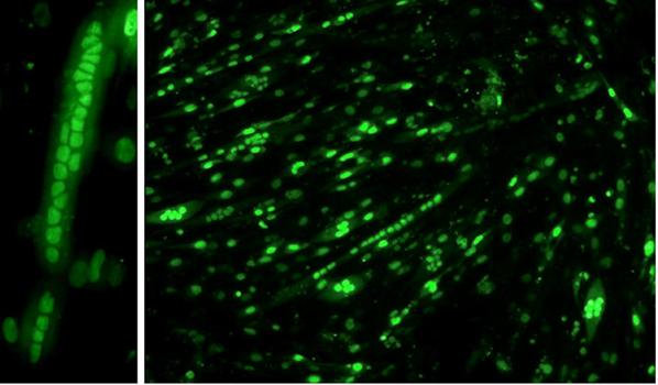 The generally applied procedure for the analysis of therapeutic exon skipping in cultured muscle cells is as followed. Muscle cells derived from DMD patients are proliferated in culture and allowed to differentiate into multinucleated myotubes through serum-deprivation. These myotube cultures are transfected with a sequence-specific, exon-internal AON with which the skipping of a specific exon can be induced. Previous years we used the cationic polymer polyethylenimine (PEI) for transfectiom, now use Lipofectamin. Lipofectamin is very efficient in delivering AONs into myotubes: up to 95% transfection efficiencies (Figure 2).