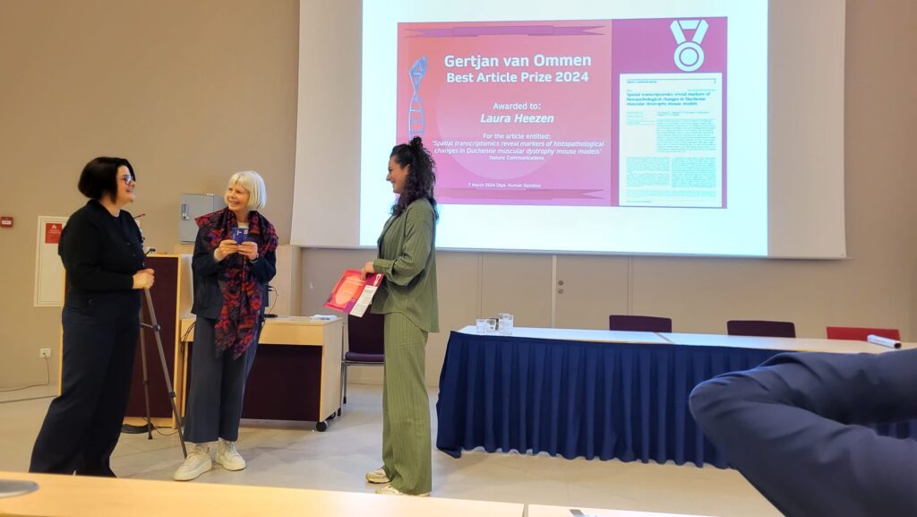 Congratulations to Laura Heezen for winning the “Gertjan van Ommen Best Article prize”. This yearly award is in honor of prof. dr. Gertjan van Ommen to commemorate his dedication and commitment the the department of Human Genetics. For her winning article, Laura Heezen pioneered the application of spatial transcriptomics on dystrophic skeletal muscle, which was published in Nature Communcations.