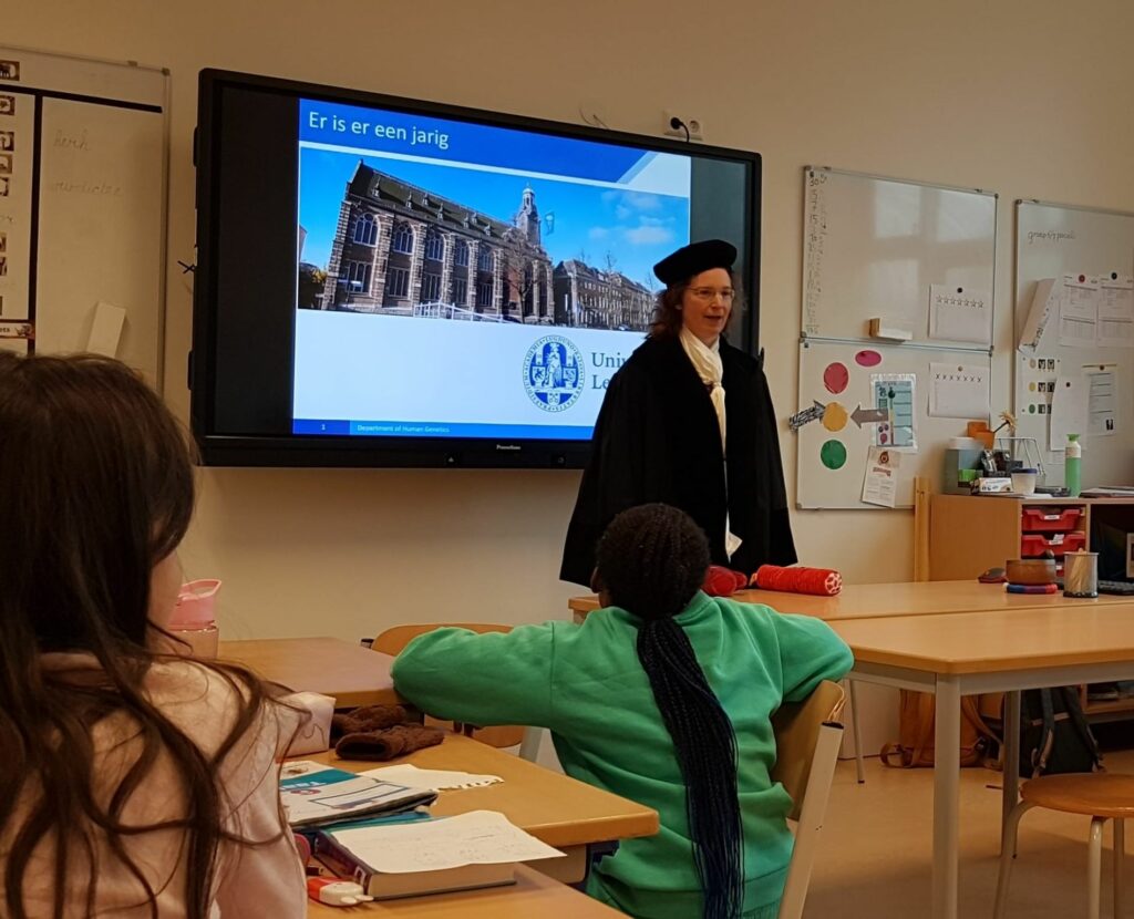 On the 8th of February, Leiden University celebrated its 449th dies natalis (birthday). Annemieke Aartsma-Rus participated in the ‘Meet the Professor’ session at the Pacelli school in Leiden. Wearing her gown, she explained what a professor does, and also what Duchenne muscular dystrophy is, how muscles work and why chicken filet is white and beef is red.