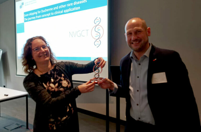 The Netherlands Society of Gene and Cell Therapy (NVGCT) established the Outstanding Achievement Award in 2019. The award honors an individual who has achieved a specific high impact contribution or a lifetime of significant contributions to the field of gene and cell therapy. Annemieke Aartsma-Rus received this award for her pioneering work in exon skipping therapy development during the award lecture at the annual NVGCT conference in Lunteren.